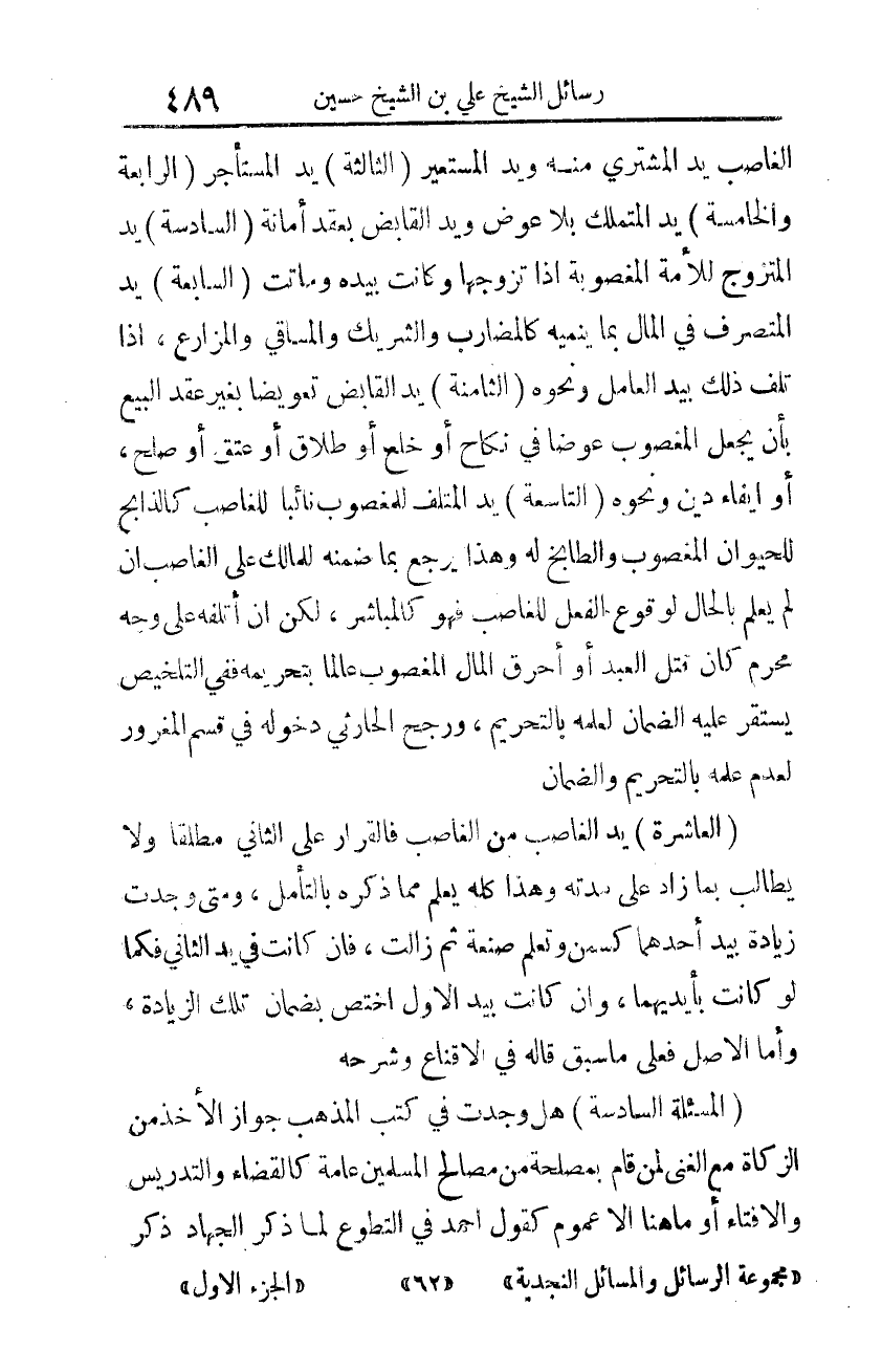 العاشرة: يد الغاصب من الغاصب فالقرار على الثّاني مطلقًا ولا يطالب بِما زاد على مدّته. وهذا كلّه يعلم مما ذكره بالتّأمّل. ومتى وجدت زيادة بيد أحدهما كسمن وتعلم صنعة ثم زالت، فإن كانت في يد الثّاني فكما لو كانت بأيديهما، وإن كانت بيد الأوّل اختصّ بضمان تلك الزّيادة. وأمّا الأصل فعلى ما سبق قاله في الإقناع وشرحه.