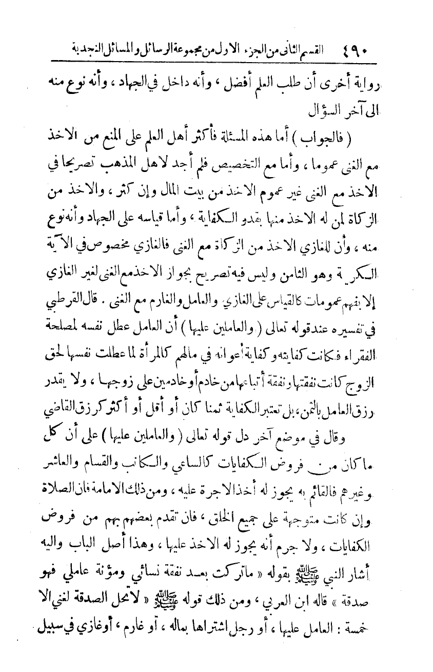 فالجواب: أمّا هذه المسألة فأكثر أهل العلم على المنع من الأخذ مع الغنى عمومًا، وأمّا مع التّخصيص فلم أجد لأهل المذهب تصريحًا في الأخذ مع الغنى غير عموم الأخذ من بيت المال وإن كثر، والأخذ من الزّكاة لِمَن له الأخذ منها بقدر الكفاية، وأمّا قياسه على الجهاد وأنّه نوع منه، وأنّ للغازي الأخذ من الزّكاة مع الغنى فالغازي مخصوص في الآية الكريمة، وهو الثّامن وليس فيه تصريح بجواز الأخذ مع الغنى لغير الغازي إلّا بفهم عمومات كالقياس على الغازي والعامل والغارم مع الغنى. قال القرطبي في تفسيره عند قوله تعالى: {وَالْعَامِلِينَ عَلَيْهَا}، [التّوبة، من الآية: 60]، أنّ العامل عطّل نفسه لمصلحة الفقراء فكانت كفايته وكفاية أعوانه في مالهم؛ كالمرأة لما عطّلت نفسها لحقّ الزّوج كانت نفقتها ونفقة أتباعها من خادم أو خادمين على زوجها، ولا يقدر رزق العامل بالثّمن؛ بل تعتبر الكفاية؛ ثمنًا كان أو أقلّ أو أكثر؛ كرزق القاضي.