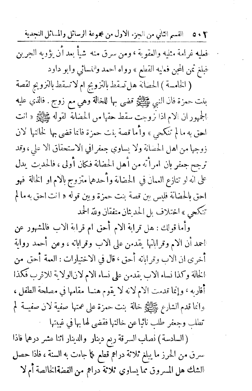 الخامسة: الحضانة هل تسقط بالتّزويج أم لا تسقط بالتّزويج لقصة بنت حمزة، فإنّ النَّبِيّ -صلّى الله عليه وسلّم- قضى بها للخالة وهي مع زوجٍ. فالذي عليه الجمهور أنّ الأم إذا تزوّجت سقط حقّها من الحضانة، لقوله -صلّى الله عليه وسلّم-: "أنت أحقّ به ما لم تنحكي". وأمّا قصة بنت حمزة فإنّما قضى بها لخالتها؛ لأنّ زوجها من أهل الحضانة، ولا يساوي جعفرًا في الاستحقاق إلّا عليّ، وقد ترجّح جعفر بأنّ امرأته من أهل الحضانة فكان أولى، فالحديث يدلّ على أنّه لو تنازع العمّان في الحضانة وأحدهما متزوّج بالأمّ أو الخالة فهو أحقّ بالحضانة فليس بين قصة بنت حمزة وبين قوله: "أنتِ أحقّ به ما لم تنكحي"اختلاف بل الحديثان متّفقان. ولله الحمد.