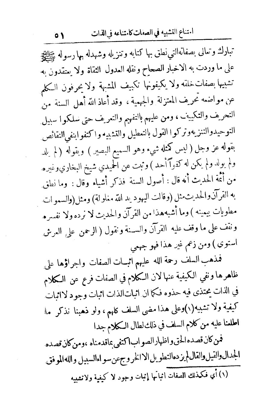 وقد أعاذ الله أهل السنة من التحريف والتكييف، ومَنَّ عليهم بالتفهيم والتعريف، حتى سلكوا سبيل التوحيد والتنْزيه، وتركوا القول بالتعطيل والتشبيه، واكتفوا بنفي النقائص بقوله عز وجل: {لَيْسَ كَمِثْلِهِ شَيْءٌ وَهُوَ السَّمِيعُ الْبَصِيرُ} [الشّورى من الآية: 11].