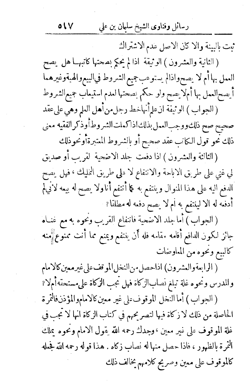 الجواب: أمّا النّخل الموقوف على غير معيّن كالإمام والمؤذّن فالثّمرة الحاصلة من ذلك لا زكاة فيها لتصريحهم في كتاب الزّكاة أنّها لا تجب في غلة الموقوف على غير معيّن، وجدك -رحمه الله- يقول الإمام ونحوه يملك الثّمرة بالظّهور، فإذا حصل منها له نصاب زكّاه. هذا قوله -رحمه الله- فجعله كالموقوف على معيّن وصريح كلامهم يخالف ذلك.