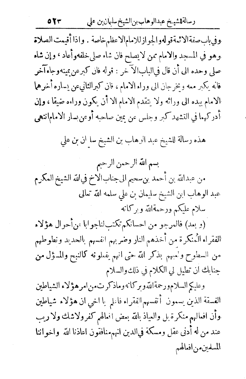 هذه رسالة للشّيخ عبد الوهّاب بن الشّيخ سليمان بن عليّ: