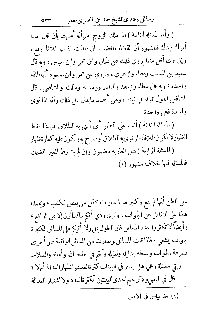 على الظّن أنّا لم تقع وكثير منها عبارات تنقل من بعض الكتب، ويحملنا هذا على التّغافل عن الجواب. وترى ودي أنّكم ما تسألون إلّا عن الواقع، وأيضًا لا تكثروا عدد المسائل فإنّ الطّول يملّ ولا يأيتكم على المسائل الكثيرة جواب يشفي، فإذا قلت المسائل وصارت من المسائل الواقعة فهو أحرى بسرعة الجواب وبسطه بدليله وتعليله وأنتم في حفظ الله وأمانه. والسّلام.