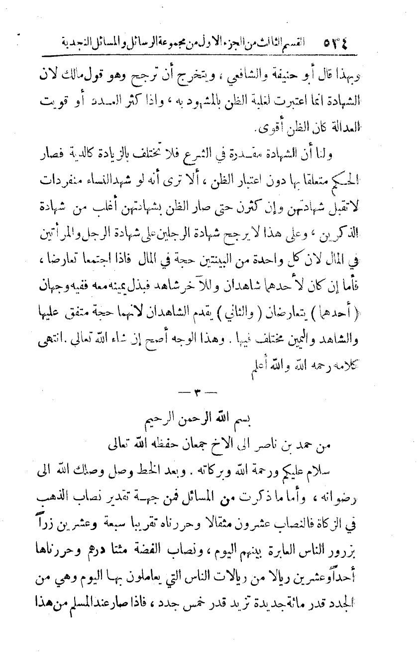 وأمّا ما ذكرت من المسائل فمن جهة تقدير نصاب الذّهب في الزّكاة فالنّصاب عشرون مثقالًا وحررناه تقريبًا سبعة وعشرين زرًا بزرور النّاس العابرة بينهم اليوم، ونصاب الفضّة مئتا درهم وحررناها أحد وعشرين ريالًا من ريالات النّاس التي يعاملون بها اليوم وهي من الجدد قدر مائة جديدة تزيد قدر خمس جدد، فإذا صار عند المسلم من هذا