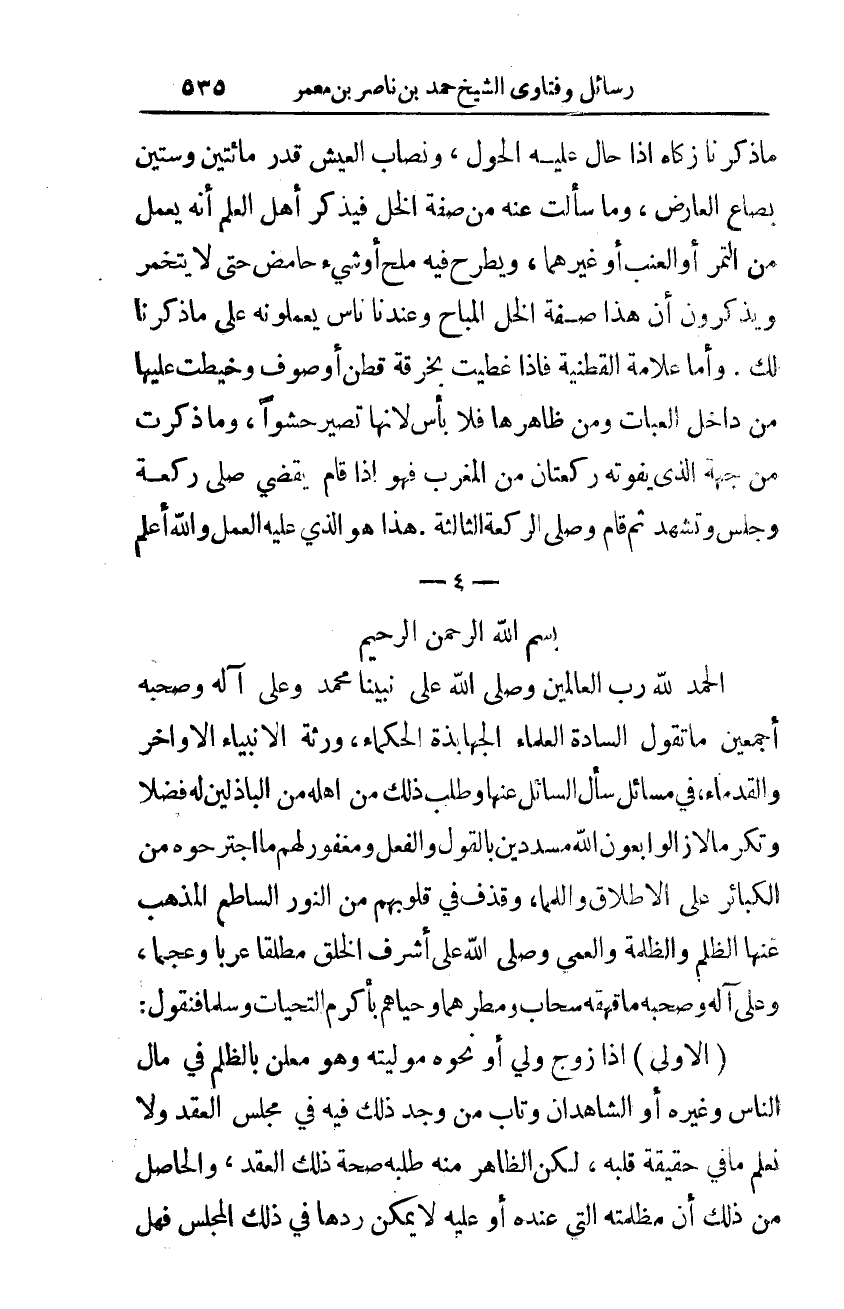 ما تقول السّادة العلماء الجهابذة الحكماء ورثة الأنبياء الأواخر والقدماء في مسائل سأل السّائل عنها وطلب ذلك من أهله من الباذلين له فضلًا، وتكرمًا لا زالوا بعون الله مسدّدين بالقول والفعل، ومغفور لهم ما اجترحوه من الكبائر على الإطلاق واللمما، وقذف في قلوبهم من النّور السّاطع المذهب عنها الظّلم والظّلمة والعمي. وصلّى الله على أشرف الخلق مطلقًا عربًا وعجمًا، وعلى آله وصحبه ما قهقه سحاب ومطرهما وحياهم بأكرم التّحيّات وسلمًا فنقول: