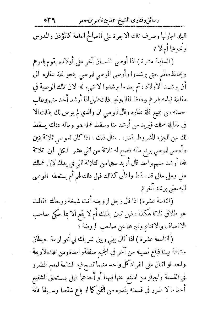 السّابعة عشرة: إذا أوصى إنسان آخر على أولاده يقوم بأمرهم ويحفظ مالهم حتّى يرشدوا وأوصى الموصي للوصي بنحو غلة عقاره إلى أن يرشد الأولاد، ثم بعد ما يرشدوا لا شيء له؛ لأنّ تلك الوصية في مقابلة قيامه بأمرهم وحفظ المال وغير ذلك، فهل إذا أرشد أحد منهم وطلب حصته من جميع غلة عقاره وقال للوصي: إنّ والدي لم يوص لك بذلك إلّا في مقابلة عملك فيريد مَن أرشد منا وسقط عمله هو وماله عنك يسقط لك من الجزء المشروط بقدره. مثل ذلك: إذا كان للموصي ثلاثة بنين وأوصى للوصي بربع ماله فصحّ له ثلاثة من اثني عشر لكلّ ابن ثلاثة، فلمّا أرشد منهم واحد قال أريد سهمًا من الثّلاثة التي في يدك؛ لأنّ عملك عليّ وعلى مالي قد سقط والثّاني كذلك، فهل ذلك لهم أم يستحقّه الموصى إليه حتّى يرشد آخرهم؟
