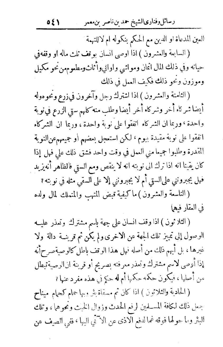الثّامنة والعشرون: إذا اشترك رجل وآخرون في زرعٍ ونحوه وله أيضًا شركاء أخر وشركاء أخر أيضًا وطلب منه كلهم سقي الزّرع في نوبة واحدةٍ، وربّما أنّ الشّركاء اتّفقوا على نوبةٍ واحدةٍ، وربّما إنّ الشّركاء اتّفقوا على نوبةٍ مقيّدة بيومٍ، لكن استعجل بعضهم أو جميعهم عن النّوبة المقدّرة وطلبوا جميعًا منِّي العمل في وقتٍ واحدٍ فشقّ ذلك عليّ، فهل إذا كان يقينًا أنّه إذا ترك إليّ نوبته أنّه لا ينقص ومع السّقي فالظّاهر أنّه يزيد، فهل يجبرونَنِي على السّقي أم لا يجبرونَنِي إلّا على السّقي مثله في نوبته؟