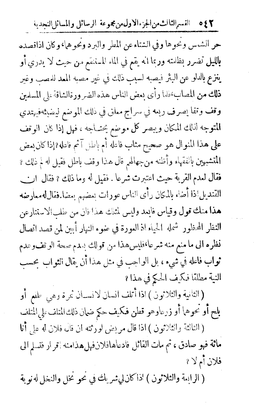 حرّ الشّمس ونحوها وفي الشّتاء عن المطر ونحوهما، وكان إذا قصده باللّيل تضرّر بظلمته وربما أنّه يقع في الماء المستنقع من حيث لا يدري أو ينْزع بالدّلو عن البئر فيصبه لسبب ذلك في غير مصبّه المعدّ للمصبّ وغير ذلك من المصاب، فلمّا رأى بعض النّاس هذه الضّرورة الشّاقّة على المسلمين وقف وقفًا يصرف ريعه في سراج معلّق في ذلك الموضع ليضيئه فيهتدي المتوجّه لذلك المكان ويبصر كلّ موضعٍ يحتاجه، فهل إذا كان الوقف على هذا المنوال هو صحيح مثاب فاعله أم باطل آثم فاعله؟ إذا كان بعض المتشبهين بالفقهاء وأظنّه من جهالهم قال هذا وقف باطل فقيل له: لِمَ ذلك؟ فقال: لعدم القربة؛ حيث اعتبرت شرعًا فقيل له: وما ذلك؟ فقال: إنّ القنديل إذا أضاء بالمكان رأى النّاس عورات بعضهم بعضًا، فقال له معارضه: هذا منك قول وقياس فأبعد، وليس لمثلك هذا، فإنّ مَن طلب الاستتار عن النّظر المحظور شمله الحياء إذ العورة في ضوء النّهار أبين لِمَن قصد اتّصال نظره إلى ما منع منه شرعًا، فليس هذا من قولك بعدم صحّة الوقف وعدم ثواب فاعله في شيء، بل الواجب في مثل هذا أن يقال: الثّواب بحسب النّيّة مطلقًا فكيف الحكم في هذا؟