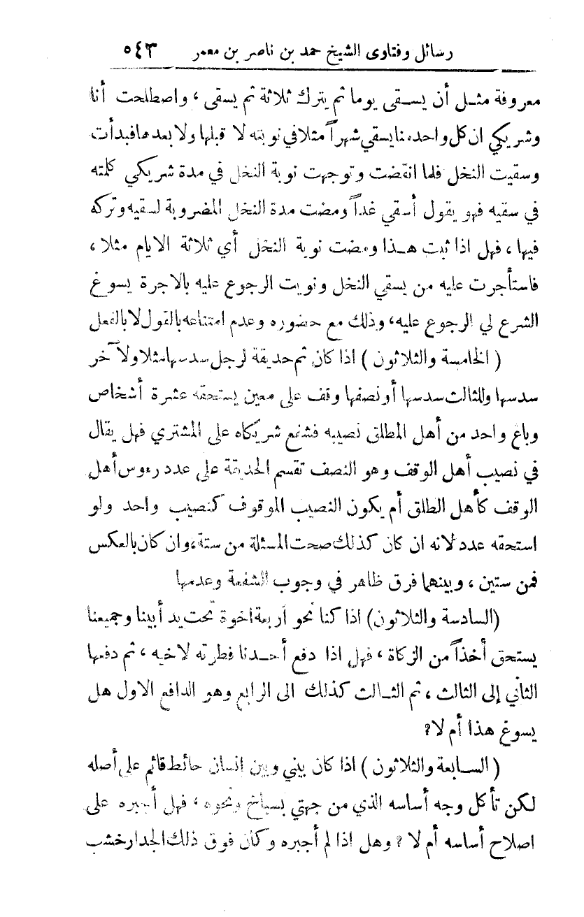 (الخامسة والثلاثون) إذا كان ثم حديقة لرجل سدسها مثلًا ولآخر سدسها وللثالث سدسها أو نصفها وقف على معين يستحقه عشرة أشخاص وباع واحد من أهل المطلق نصيبه فشفع شريكاه على المشتري فهل يقال في نصيب أهل الوقف وهو النصف تقسم الحديقة على عدد رءوس أهل الوقف كأهل الطلق أم يكون النصيب الموقوف كنصيب واحد ولو استحقه عدد لأنه إن كان كذلك صحت المسألة من ستة، وإن كان بالعكس فمن ستين، وبينهما فرق ظاهر في وجوب الشفعة وعدمها.