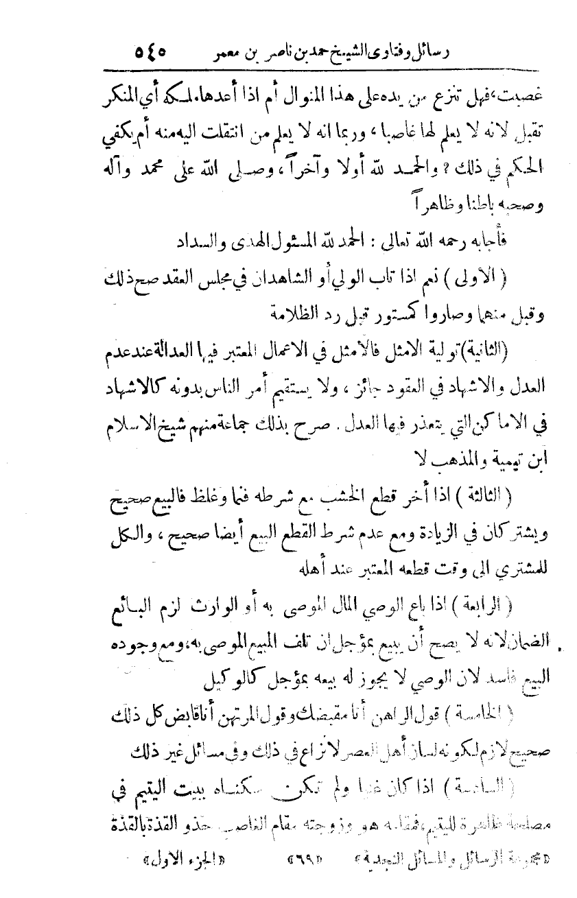 فأجابه -رحمه الله تعالى-: الحمد لله المسؤول الهدى والسّداد: