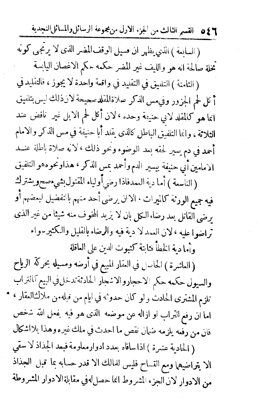 الثّامنة: التّلفيق في التّقليد في واقعةٍ واحدةٍ لا يجوز، فالتّقليد في أكل لحم الجزور وفي مسّ الذّكر، صلاة المقلد صحيحة؛ لأنّ ذلك ليس بتلفيق، إنّما هو كالمقلّد لأبي حنيفة وحده، لأنّ أكل لحم الإبل غير ناقض عند الثّلاثة، وإنّما التّلفيق الباطل كالذي يقلّد أبا حنيفة في مسّ الذّكر والإمام أحمد في دم يسير لحقه بعد الوضوء ونحو ذلك؛ لأنّه صلاة باطلة عند الإمامين: أبي حنيفة بيسير الدّم وأحمد بمسّ الذّكر، هذا ونحوه هو التّلفيق.