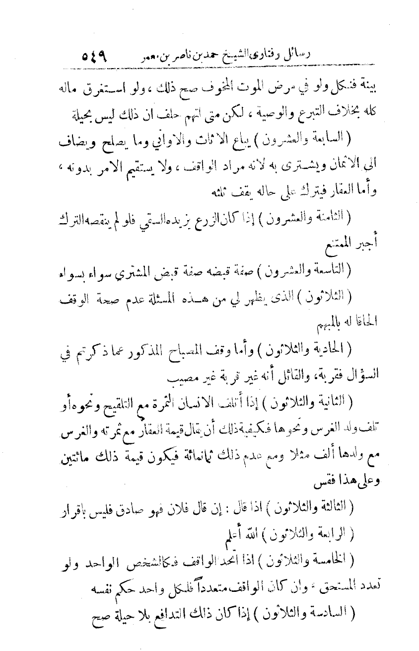 الثّانية والثّلاثون: إذا أتلف الإنسان الثّمرة مع التّلقيح ونحوه أو تلف ولد الغرس ونحوها فكيفية ذلك أن يقال قيمة العقار مع ثمرته والغرس مع ولدها ألف مثلًا، ومع عدم ذلك ثمانمائة فيكون قيمة ذلك مائتين وعلى هذا فقس.