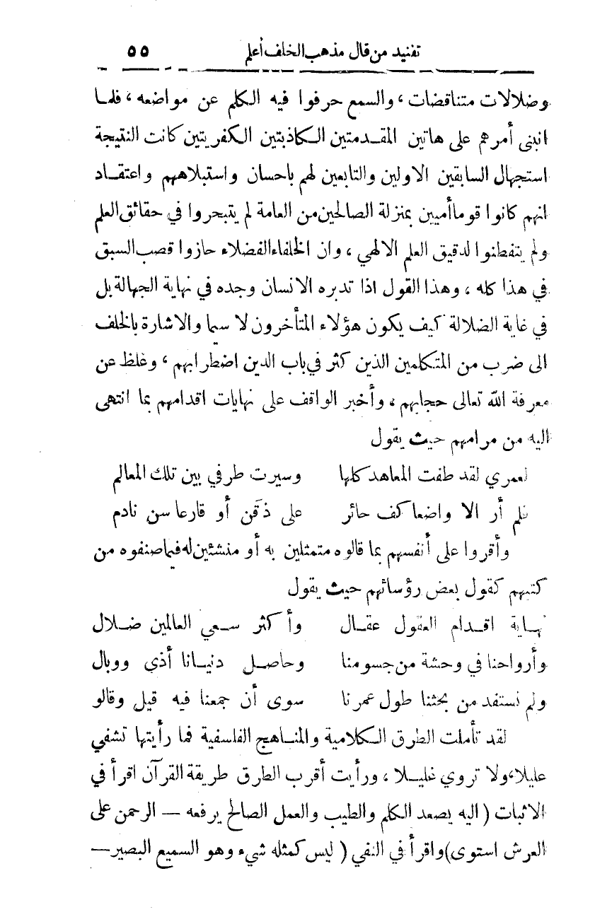 لقد تأملت الطرق الكلامية والمناهج الفلسفية، فما رأيتها تشفي عليلا، ولا تروي غليلا؛ ورأيت أقرب الطرق طريقة القرآن: اقرأ في الإثبات: {إِلَيْهِ يَصْعَدُ الْكَلِمُ الطَّيِّبُ وَالْعَمَلُ الصَّالِحُ يَرْفَعُهُ} [فاطر من الآية: 10]، {الرَّحْمَنُ عَلَى الْعَرْشِ اسْتَوَى} [طه: 5]، واقرأ في النفي: {لَيْسَ كَمِثْلِهِ شَيْءٌ وَهُوَ السَّمِيعُ الْبَصِيرُ} [الشّورى من الآية: 11]،