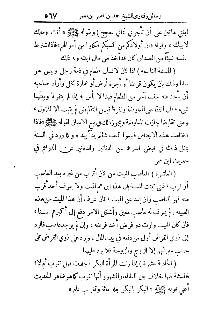 العاشرة: العاصب للميّت مَن كان أقرب من غيره بعد العاصب أو قرب، فمتى ثبتت النّسبة بأنّ هذا ابن عمّ الميّت ولا يعرف أحد أقرب منه فهو العاصب وإن بَعُدَ عن الميّت، فإن عرف أنّ هذا الميّت من هذه القبيلة ولم يعرف له عاصب معيّن وأشكل الأمر دفع إلى أكبَرهم سنًا، فإن كان للميّت وارث ذو فرضٍ أخذ فرضه، وإن لم يوجد عاصب فالرّدّ إلى ذوي الفرض أولى من دفعه إلى بيت المال، ويردّ على ذوي الفرض على حسب ميراثهم إلّا الزّوج والزّوجة فلا يردّ عليهما.