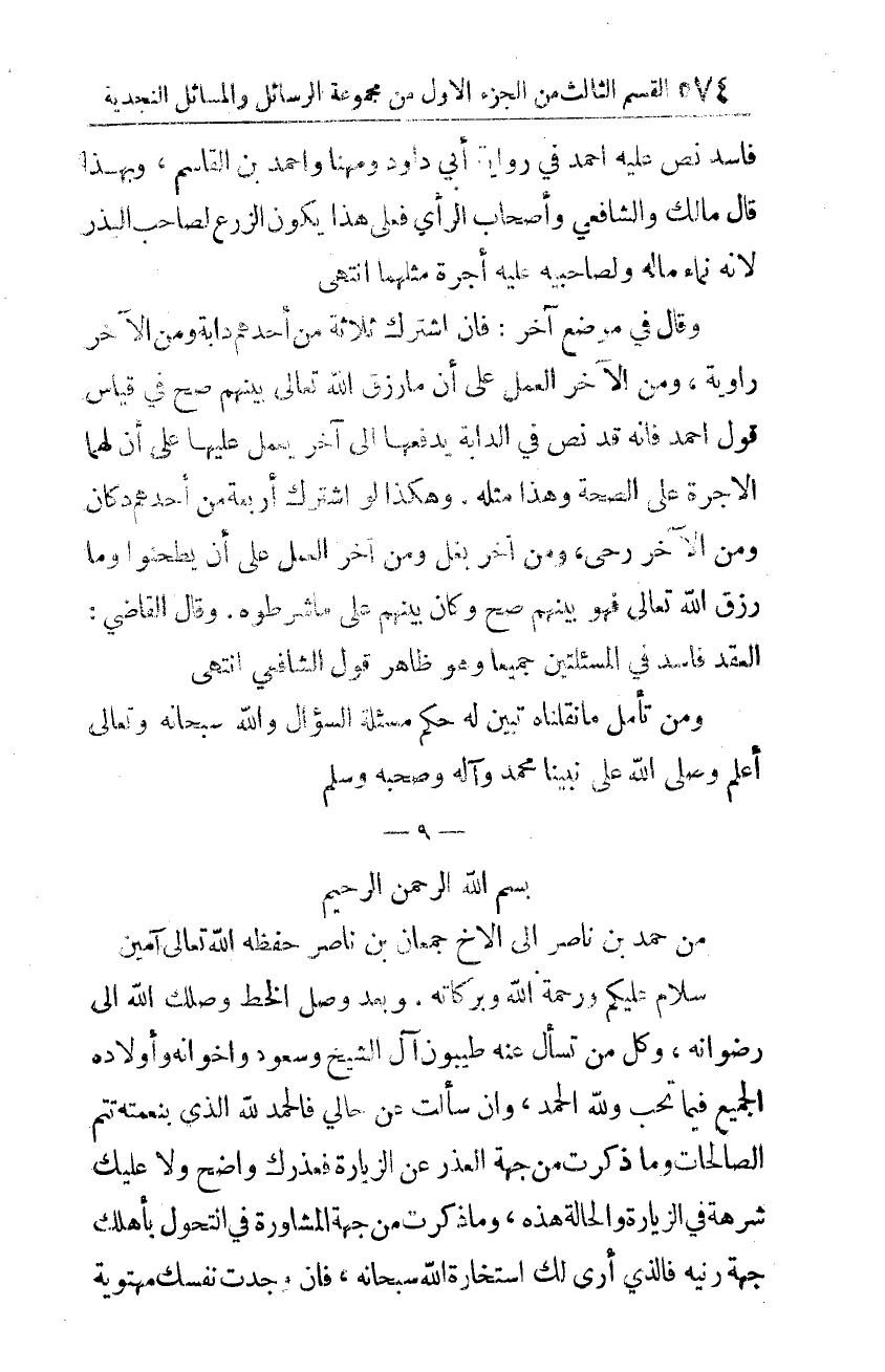 وصل الخط وصلك الله إلى رضوانه، وكلّ مَن تسأل عنه طيّبون، آل الشّيخ وسعود وإخوانه وأولاده، الجميع فيما تحبّ ولله الحمد. وإنّ سألت عن حالي فالحمد لله الي بنعمته تَتِمُّ الصّالحات. وما ذكرت من جهة العذر عن الزّيارة فعذرك واضح ولا عليك شرهة في الزّيارة والحالة هذه، وما ذكرت من جهة المشاورة في التّحوّل بأهلك جهة رنية فالذي أرى لك استخارة الله سبحانه. فإن وجدت نفسك مهتوية