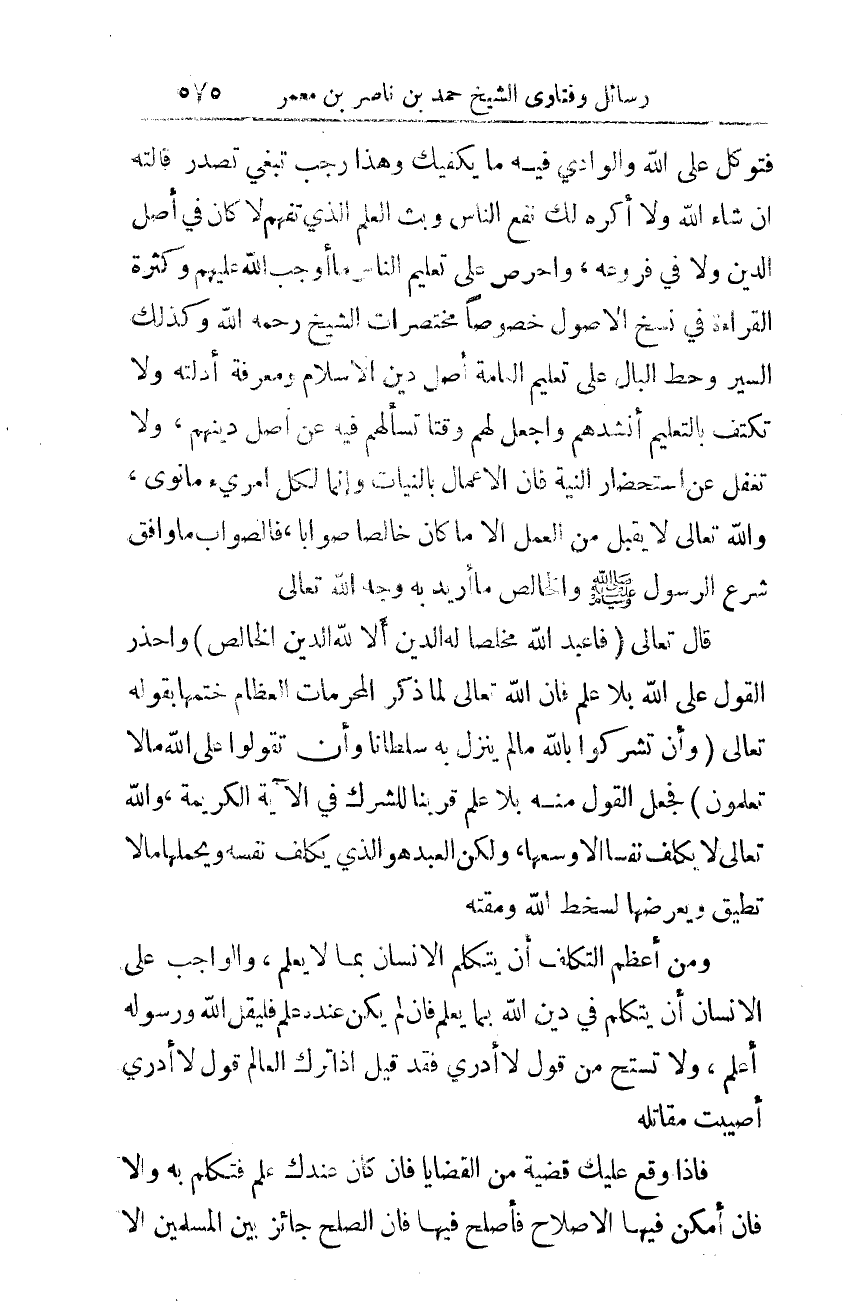 فتوكّل على الله والوادي فيه ما يكفيك. وهذا رجب تبغي تصدر قالته إن شاء الله، ولا أكره لك نفع النّاس وبثّ العلم الذي تفهم لا كان في أصل الدِّين ولا في فروعه، واحرص على تعليم النّاس ما أوجب الله عليهم وكثرة القراءة في نسخ الأصول خصوصًا مختصرات الشّيخ رحمه الله، وكذلك السّير وحط البال على تعليم العامّة أصل دين الإسلام ومعرفة أدلّته ولا تكتف بالتعليم أنشدهم واجعل لهم وقتًا تسألهم فيه عن أصل دِينهم، ولا تغفل عن استحضار النّيّة فإن الأعمال بالنّيّات، وإنّكما لكلّ امرئ ما نوى، والله تعالى لا يقبل من العمل إلّا ما كان خالصًا صوابًا، فالصّواب ما وافق شرع الرّسول -صلّى الله عليه وسلّم-، والخالص ما أريد به وجه الله تعالى.