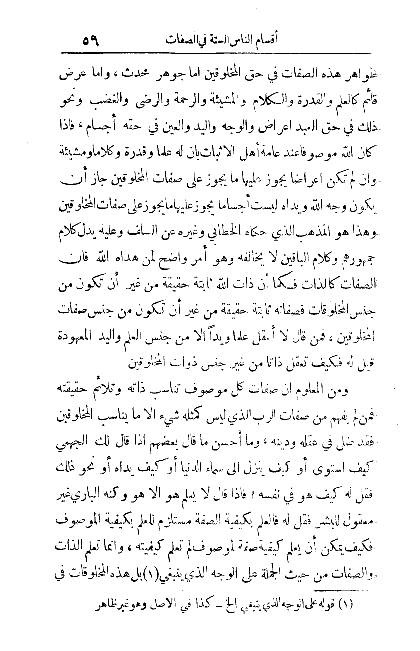 فكما أن ذات الله ثابتة حقيقة من غير أن تكون من جنس المخلوقات، فصفاته ثابتة حقيقة من غير أن تكون من جنس صفات المخلوقين. فمن قال: لا أعقل علما ويدا إلا من جنس العلم واليد المعهودة، قيل له: فكيف تعقل ذاتا من غير جنس ذوات المخلوقين ومن المعلوم أن صفات كل موصوف تناسب ذاته، وتلائم حقيقته. فمن لم يفهم من صفات الرب الذي ليس كمثله شيء إلا ما يناسب المخلوقين فقد ضل في عقله ودينه، وما أحسن ما قال بعضهم: إذا قال لك الجهمي: كيف استوى أو كيف ينْزل إلى سماء الدنيا أو كيف يداه أو نحو ذلك، فقل له: كيف هو في نفسه فإذا قال: لا يعلم هو إلا هو، وكنه الباري غير معقول للبشر، فقل له: فالعلم بكيفية الصفة مستلزم للعلم بكيفية الموصوف؛ فكيف يمكن أن يعلم كيفية صفة لموصوف لم تعلم كيفيته وإنما تعلم الذات والصفات من حيث الجملة على الوجه الذي ينبغي 1. بل هذه المخلوقات في