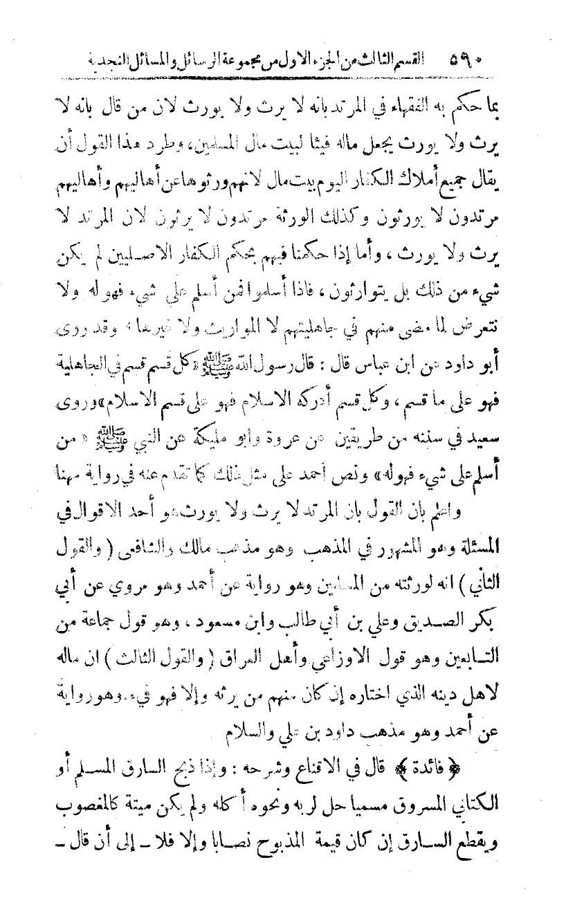 والقول الثّالث: أنّ ماله لأهل دِينه الذي اختاره إن كان منهم مَن يرثه وإلّا فهو فيء. وهو رواية عن أحمد. وهو مذهب داود بن عليّ. والسّلام.