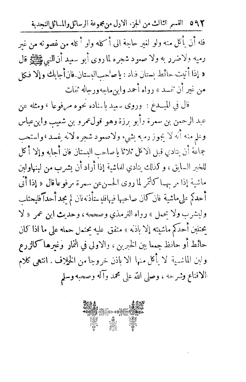 وكذلك ينادي للماشية إذا أراد أن يشرب من لبنها ولبن ماشية إذا مرّ بها كالثّمر، لما روى الحسن عن سمرة مرفوعًا قال: "إذا أتى أحدكم على ماشيةٍ فإن كان صاحبها فيها فليستأذنه فإن لم يجد أحدًا فليحتلب وليشرب ولا يحمل". رواه التّرمذي وصحّحه. وحديث ابن عمر: "لا يحتلبن أحدكم مشايته إلّا بإذنه". متّفق عليه يحتمل حمله على ما إذا كان حائط أو حافظ جمعًا بين الخبرين. والأولى في الثّمار وغيرها كالزّرع ولبن الماشية لا يأكل منها إلّا بإذنٍ خروجًا من الخلاف. انتهى كلام الإقناع وشرحه.