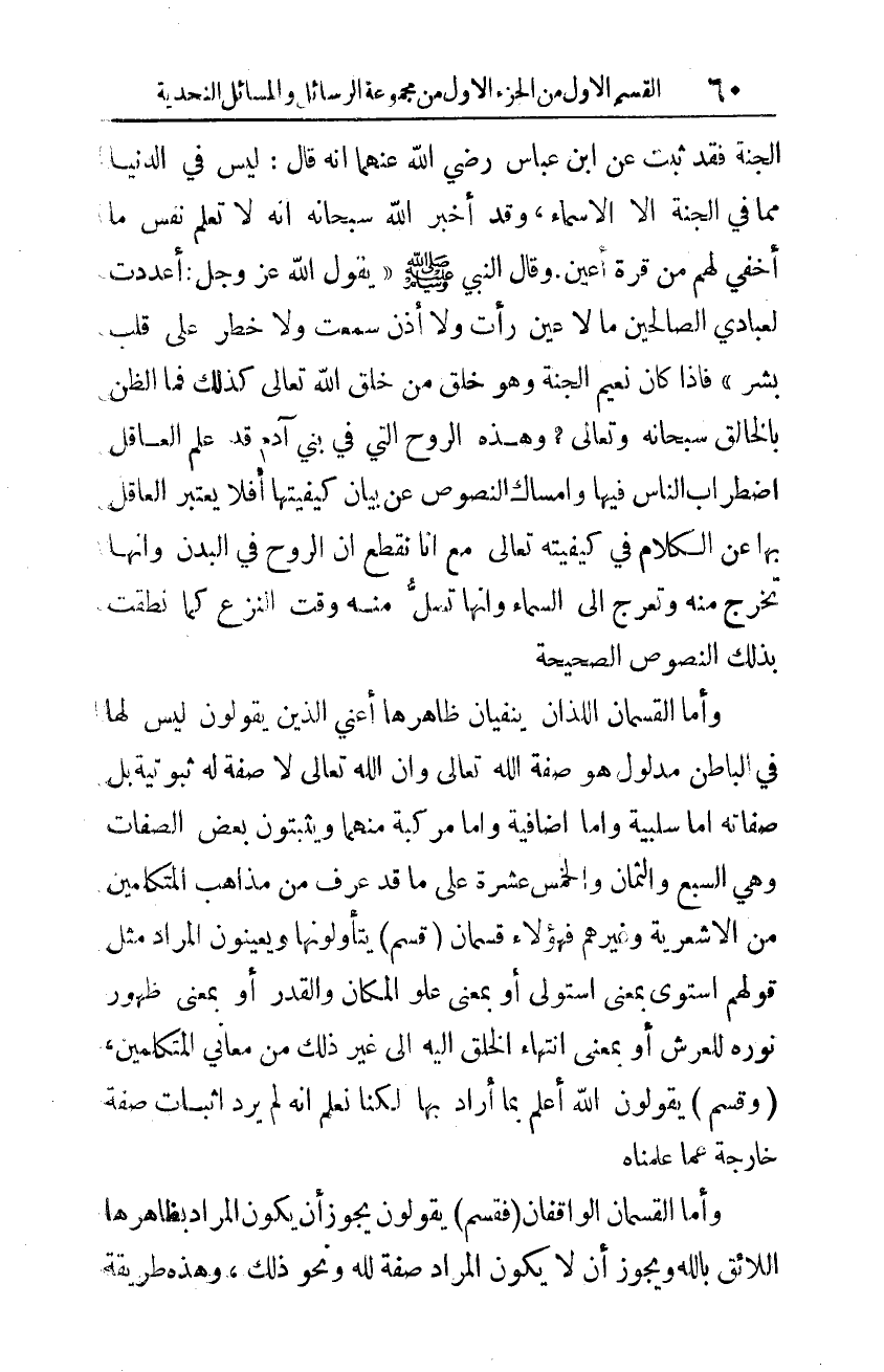 وقال النبي صلى الله عليه وسلم: "يقول الله عز وجل: أعددت لعبادي الصالحين ما لا عين رأت، ولا أذن سمعت، ولا خطر على قلب بشر"1 فإذا كان نعيم الجنة وهو خلق من خلق الله تعالى كذلك، فما الظن بالخالق -سبحانه وتعالى- وهذه الروح التي في بني آدم قد علم العاقل اضطراب الناس فيها، وإمساك النصوص عن بيان كيفيتها، أفلا يعتبر العاقل بها عن الكلام في كيفيته تعالى مع أنا نقطع أن الروح في البدن، وأنها تخرج منه، وتعرج إلى السماء، وأنها تسلُّ منه وقت النَزع كما نطقت بذلك النصوص الصحيحة.