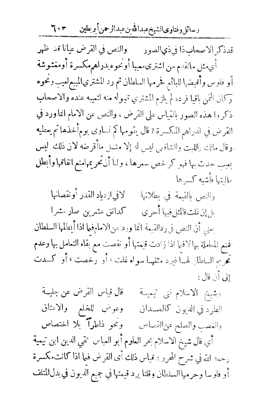 وشيخ الإسلام فتى تيمية ... قال قياس القرض عن جلية