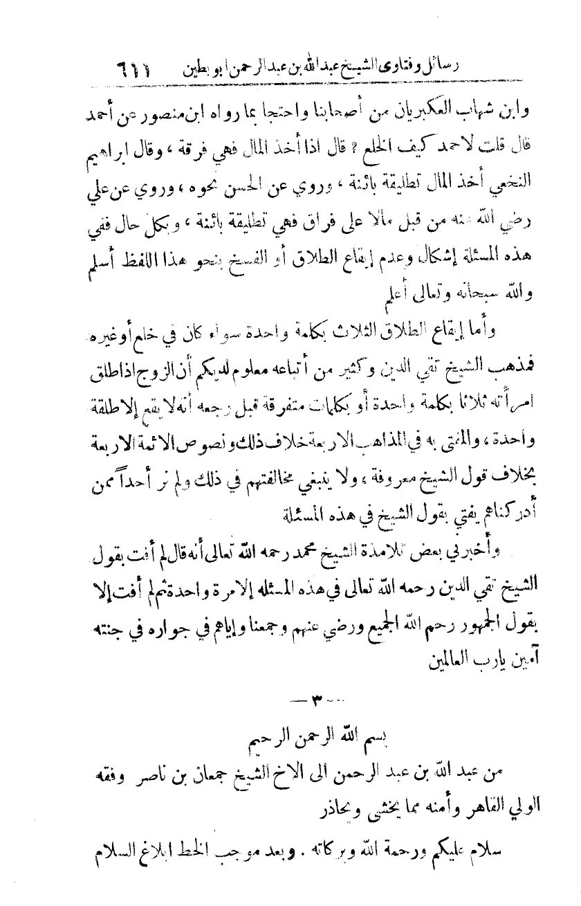 من عبد الله بن عبد الرّحمن إلى الأخ الشّيخ جمعان بن ناصر وفّقه الوليّ القاهر وأمّنه مما يخشى ويحاذر.