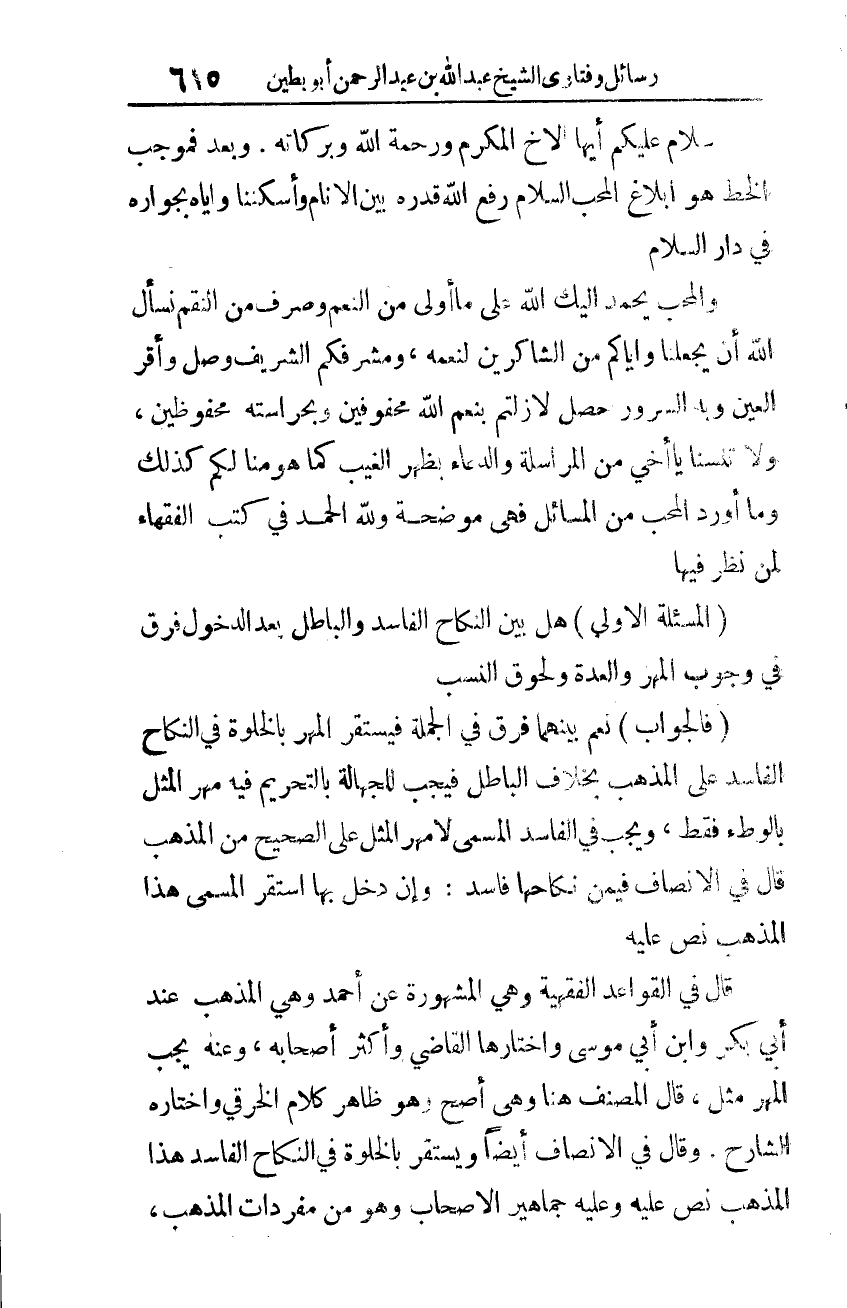 والمحب يحمد إليك الله على ما أولى من النّعم وصرف من النّقم، نسأل الله أن يجعلنا وإيّاكم من الشّاكرين لنعمه، ومشرفكم الشّريف وصل وأقرّ العين، وبه السّرور حصل لا زلتم بنعم الله محفوفين وبحراسته محفوظين، ولا تنسنا يا أخي من المراسلة والدّعاء بظهر الغيب كما هو منا لكم كذلك وما أورد المحب من المسائل فهي موضحة. ولله الحمد في كتب الفقهاء لِمَن نظر فيها:
