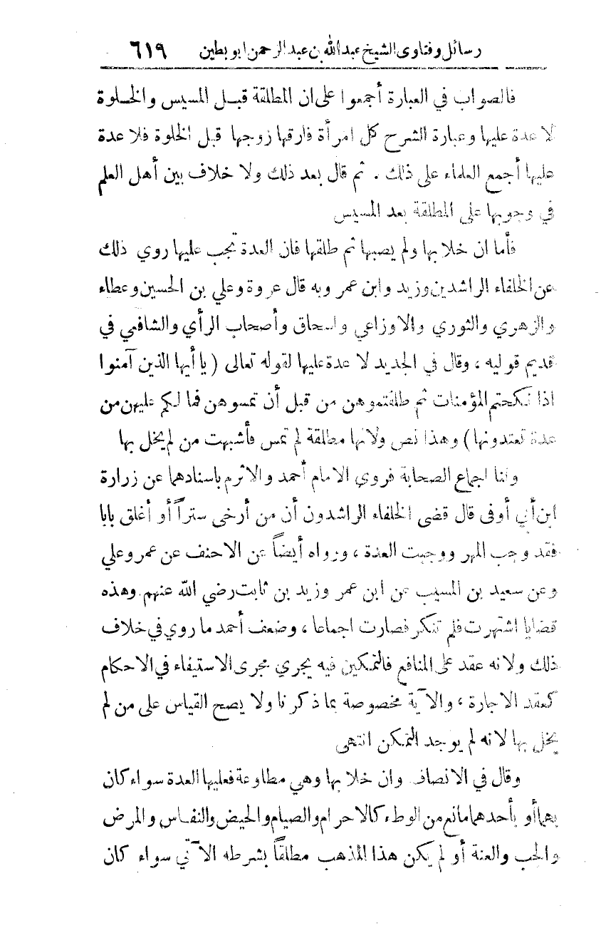 فالصّواب في العبارة: أجمعوا على أنّ المطلقة قبل المسيس والخلوة لا عدّة عليها، وعبارة الشّرح: كلّ امرأةٍ فارقها زوجها قبل الخلوة فلا عدّة عليها أجمع العلماء على ذلك. ثم قال بعد ذلك: ولا خلاف بين أهل العلم في وجوبها على المطلقة بعد المسيس.