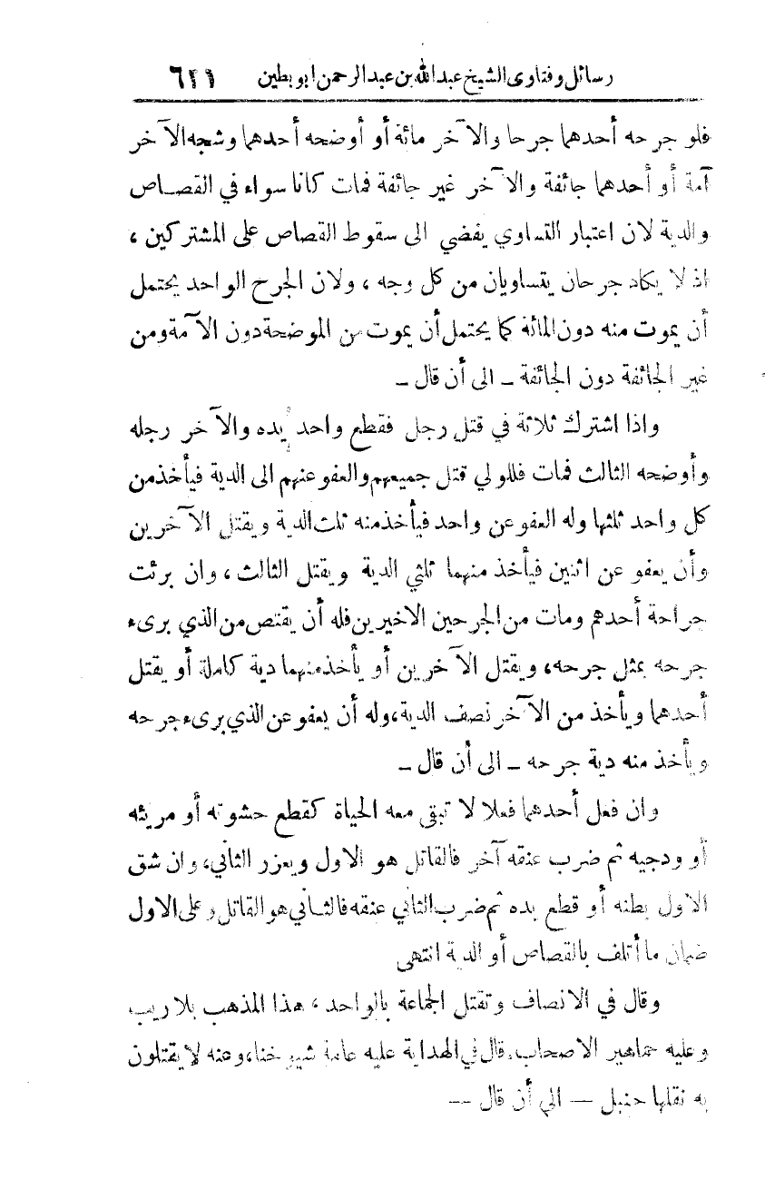 وإذا اشترك ثلاثة في قتل فقطع واحد يده والآخر رجله، وأوضحه الثّالث فمات فللولي قتل جميعهم والعفو عنهم إلى الدّية، فيأخذ من كلّ واحدٍ ثلثها، وله العفو عن واحدٍ فيأخذ منه ثلث الدّية، ويقتل الآخرين، وأن يفعو عن اثنين فيأخذ منها ثلثي الدّية ويقتل الثّالث، وإن برئت جراحة أحدهم ومات من الجرحين الأخيرين، فله أن يقتصّ من الذي برئ جرحه بمثل جرحه، ويقتل الآخرين أو يأخذ منها دية كاملة أو يقتل أحدهما ويأخذ من الآخرين نصف الدّية. وله أن يعفو عن الذي برئ جرحه ويأخذ منه دية جرحه إلى أن قال: