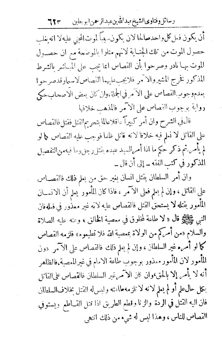 وإن أمر السّلطان بقتل إنسانٍ بغير حقٍّ مَن يعلم ذلك فالقصاص على القاتل، وإن لم يعلم فعلى الآمر. فإذا كان المأمور يعلم أنّ الإنسان المأمور بقتله لا يستحقّ القتل فالقصاص عليه؛ لأنّه غير معذورٍ في فعله؛ فإنّ النَّبِيّ -صلّى الله عليه وسلّم- قال: "لا طاعة لمخلوقٍ في معصية الخالق". وعنه - عليه الصّلاة والسّلام -: "مَن أمركم من الولاة بمعصية الله فلا تطيعوه". فلزمه القصاص كما لو أمره غير السّلطان. وإن لم يعلم ذلك فالقصاص على الآمر دون المأمور؛ لأنّ المأمور معذور بوجوب طاعة الإمام في غير المعصية. فالظّاهر أنّه لا يأمر إلّا بالحقّ.