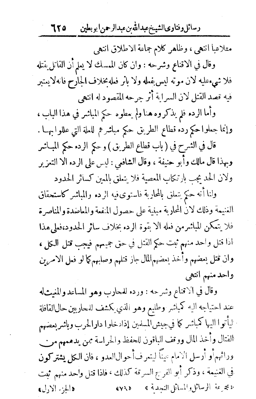 ولنا أنّه حكم يتعلّق بالمحاربة فاستوى فيه الرّدء والمباشر كاستحقاق الغنيمة؛ وذلك لأنّ المحاربة مبنية على حصول المنفعة والمعاضدة والمناصرة، فلا يتمكّن المباشر من فعله إلّا بقوّة الرّدء بخلاف سائر الحدود، فعلى هذا إذا قتل واحد منهم ثبت حكم القتل في حقّ جميعهم، فيجب قتل الكلّ، وإن قتل بعضهم وأخذ بعضهم المال جاز قتلهم وصلبهم كما لو فعل الأمرين واحد منهم. انتهى.
