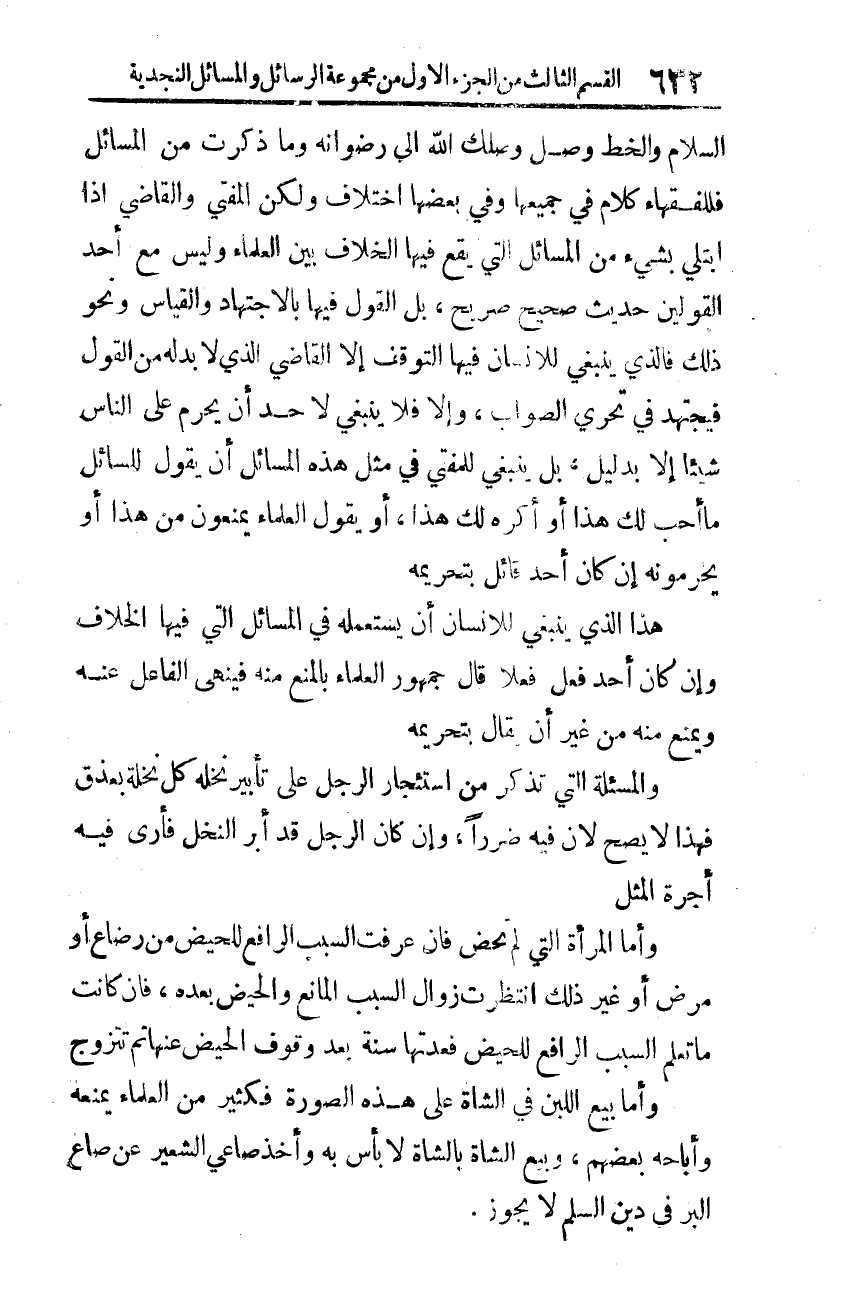 السلام. والخط وصل، وصلك الله إلى رضوانه. وما ذكرت من المسائل فللفقهاء كلام في جميعها، وفي بعضها اختلاف، ولكن المفتي والقاضي إذا ابتلي بشيء من المسائل التي يقع فيها الخلاف بين العلماء وليس مع أحد القولين حديث صحيح صريح، بل القول فيها بالاجتهاد والقياس ونحو ذلك، فالذي ينبغي للإنسان فيها التوقف، إلا القاضي الذي لا بد له من القول فيجتهد في تحري الصواب، وإلا فلا ينبغي لأحد أن يحرم على الناس شيئًا إلا بدليل. بل ينبغي للمفتي في مثل هذه المسائل أن يقول للسائل: ما أحب لك هذا، أو أكره لك هذا، أو يقول: العلماء يمنعون من هذا، أو يحرمونه إن كان أحد قائل بتحريمه.