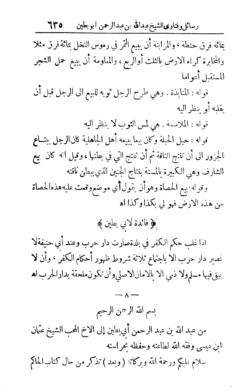 من عبد الله بن عبد الرّحمن أبي بطين إلى الأخ المحبّ الشّيخ عثمان بن عيسى وفّقه الله لطاعته وحفظه بحراسته.