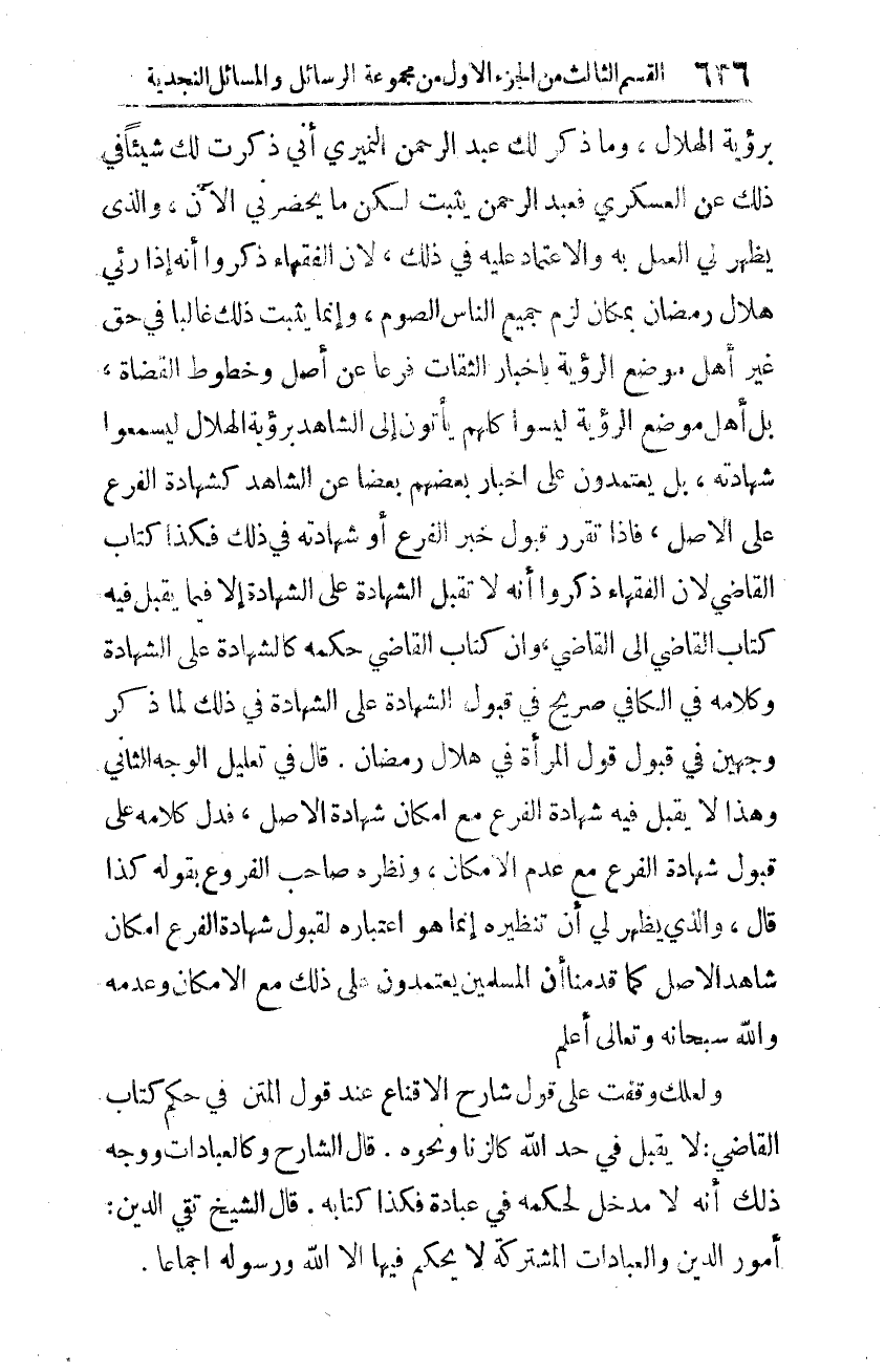 ولعلّك وفقت على قول شارح الإقناع عند قول المتن في حكم كتاب القاضي: لا يقبل في حدّ الله كالزّنا ونحوه. قال الشّارح: وكالعبادات ووجه ذلك؛ أنّه لا مدخل لحكمه في عبادة، فكذا كتابه. قال الشّيخ تقيّ الدِّين: أمور الدِّين والعبادات المشتركة لا يحكم فيها إلّا الله ورسوله إجماعًا.