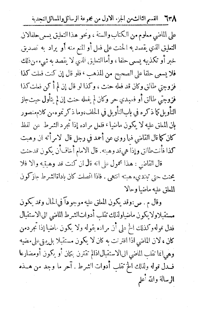 وقال م. ص: وقد يكون المعلّق عليه موجودًا في الحال، وقد يكون مستقبلًا ولا يكون ماضيًا، ولذلك تقلب أدوات الشّرط الماضي إلى الاستقبال، فدلّ قوله: وكذلك ... الخ على أنّ مراده بقوله: ولا يكون ماضيًا، إذا تجرّد من كان؛ لأنّ الماضي إذا اقترنت به كان لا يكون مستقبلًا، بل يبقى على مضيه، وهي إنّما تقلب الماضي إلى الاستقبال إذا لم تقترن بكان أو يكون أو مضارعًا، فدلّ قوله: ولذلك الخ، تقلب أدوات الشّرط، آخر ما وجد من هذه الرّسالة. والله أعلم.