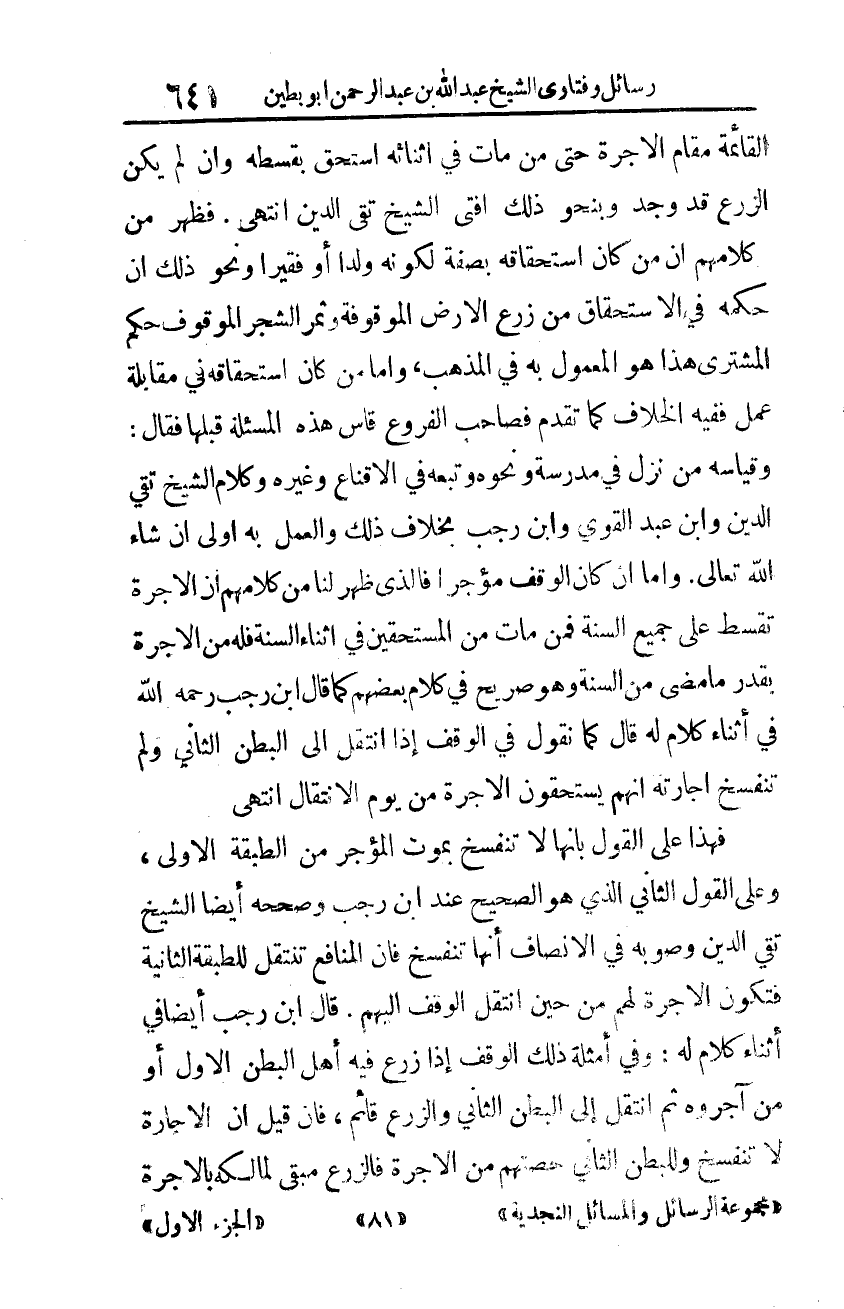 فهذا يدلّ على القول بأنّها لا تنفسخ بموت المؤجّر من الطّبعة الأولى، وعلى القول الثّاني الذي هو الصّحيح عند ابن رجب وصحّحه أيضًا الشّيخ تقيّ الدِّين وصوّبه في الإنصاف أنّها تنفسخ، فإنّ المنافع تنتقل للطّبقة الثّانية، فتكون الأجرة لهم من حين انتقل الوقف إليهم.