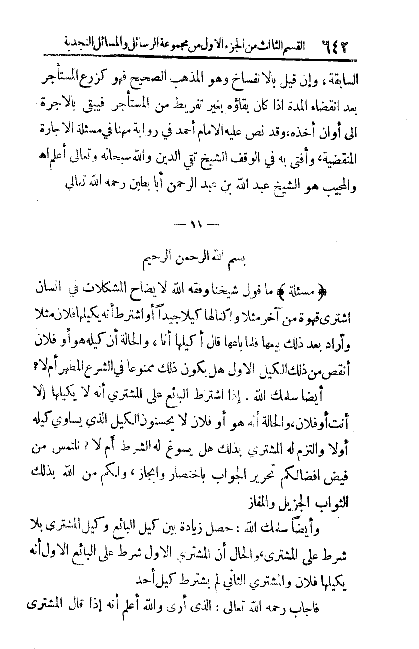 {مسألة} ما قول شيخنا -وفّقه الله لإيضاح المشكلات- في إنسانٍ اشترى قهوة من آخر مثلًا واكتالها كيلًا جيدًا، أو اشترط أنّه يكيلها فلان مثلًا، وأراد بعد ذلك بيعها، فلما باعها قال: أكيلها أنا، والحالة أنّ كيله هو أو فلان أنقص من ذلك الكيل الأوّل، هل يكون ذلك ممنوعًا في الشّرع المطهر أم لا؟