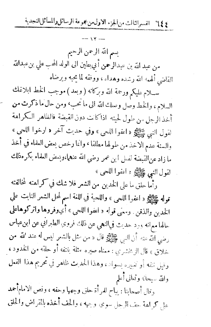 موجب الخطّ إبلاغك السّلام. والخط وصل وصلك الله إلى ما تحب. ومن حال ما ذكرت من أخذ الرّجل من طول لحيته إذا كانت دون القبضة فالظّاهر الكراهة، لقول النَّبِيّ -صلّى الله عليه وسلّم-: "اعفوا اللّحى"، وفي حديثٍ آخر: "ارخوا اللُّحى". والسّنة عدم الأخذ من طولها مطلقًا. وإنّما رخص بعض العلماء في أخذ ما زاد على القبضة لفعل ابن عمر -رضي الله عنهما-، وبعض العلماء يكره ذلك لقول النَّبِيّ -صلّى الله عليه وسلّم-: "اعفوا اللّحى".