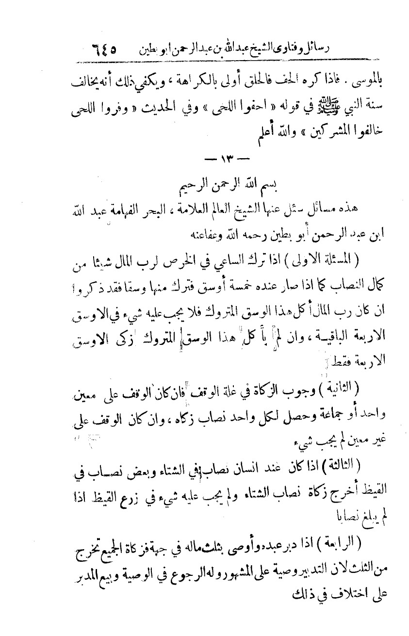 هذه مسائل سُئِلَ عنها الشّيخ العالم العلّامة البحر الفهّامة عبد الله بن عبد الرّحمن أبو بطين رحمه الله وعفا عنه: