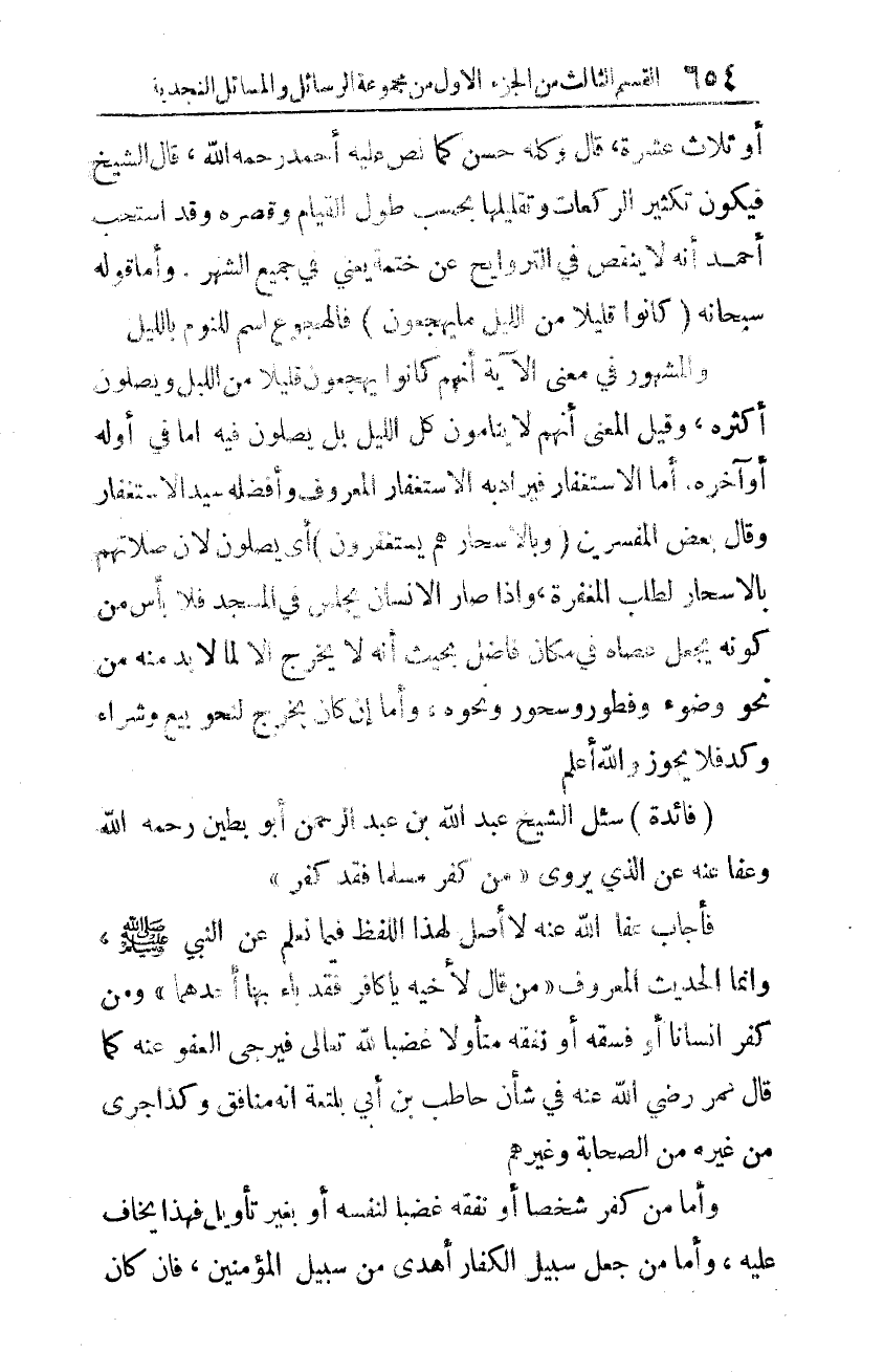 فائدة: سُئِل الشّيخ عبد الله بن عبد الرّحمن أبو بطين رحمه الله، وعفا عنه عن الذي يروى: "مَن كفّر مسلمًا فقد كفر".