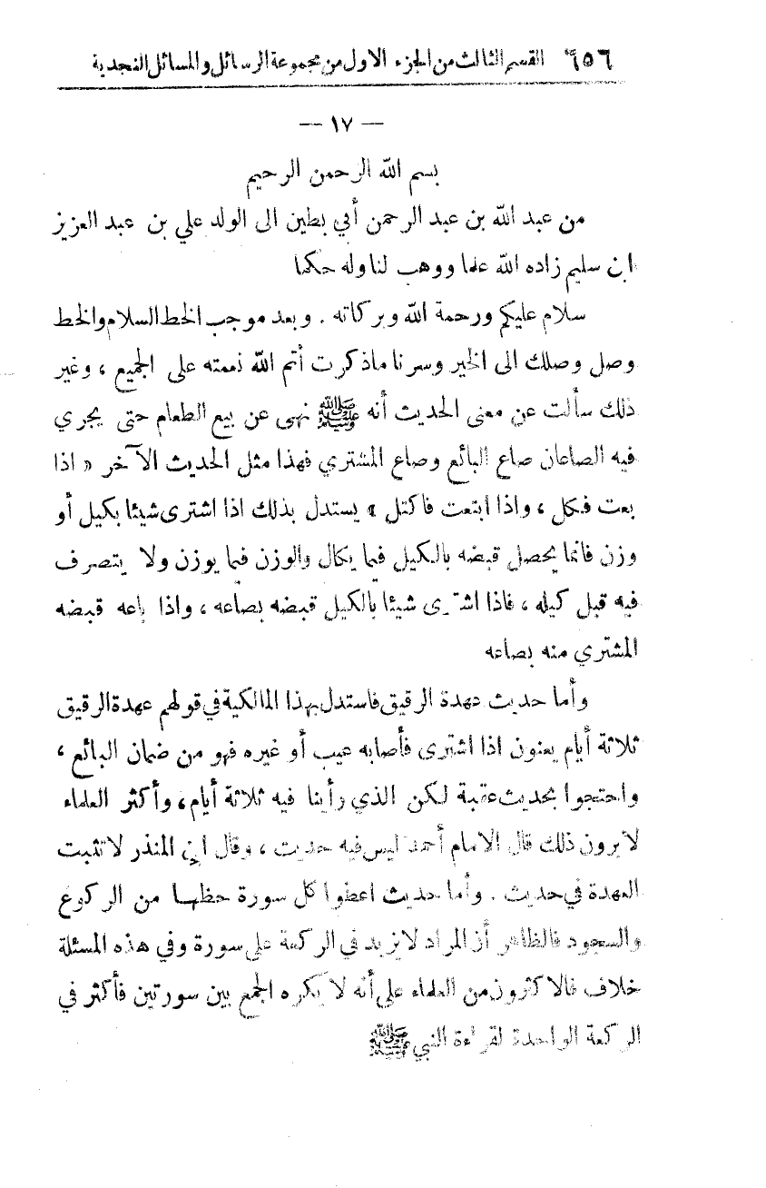 موجب الخط السّلام والخط وصل، وصلك إلى الخير، وسرّنا ما ذكرت أتم الله نعمته على الجميع، وغير ذلك سألت عن معنى الحديث أنّه -صلّى الله عليه وسلّم- نهى عن بيع الطّعام حتّى يجري فيه الصّاعان: صاع البائع، وصاع المشتري، فهذا مثل الحديث الآخر: "إذا بعت فكل، وإذا ابتعت فاكتل"، يستدلّ بذلك إذا اشترى شيئًا بكيلٍ أو وزنٍ فإنّما يحصل قبضه بالكيل فيما يكال، والوزن فيما يوزن، ولا يتصرّف فيه قبل كيله، فإذا اشترى شيئًا بالكيل قبضه بصاعه، وإذا باعه قبضه المشتري منه بصاعه.