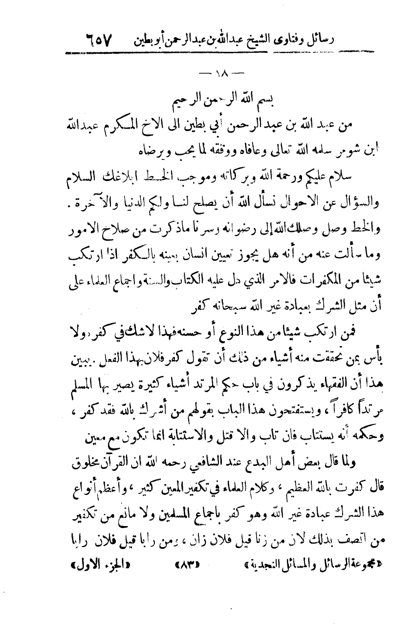 من عبد الله بن عبد الرّحمن أبي بطين، إلى الأخ المكرّم عبد الله بن شومر سلّمه الله تعالى وعافاه ووفّقه لما يحبّ ويرضاه.