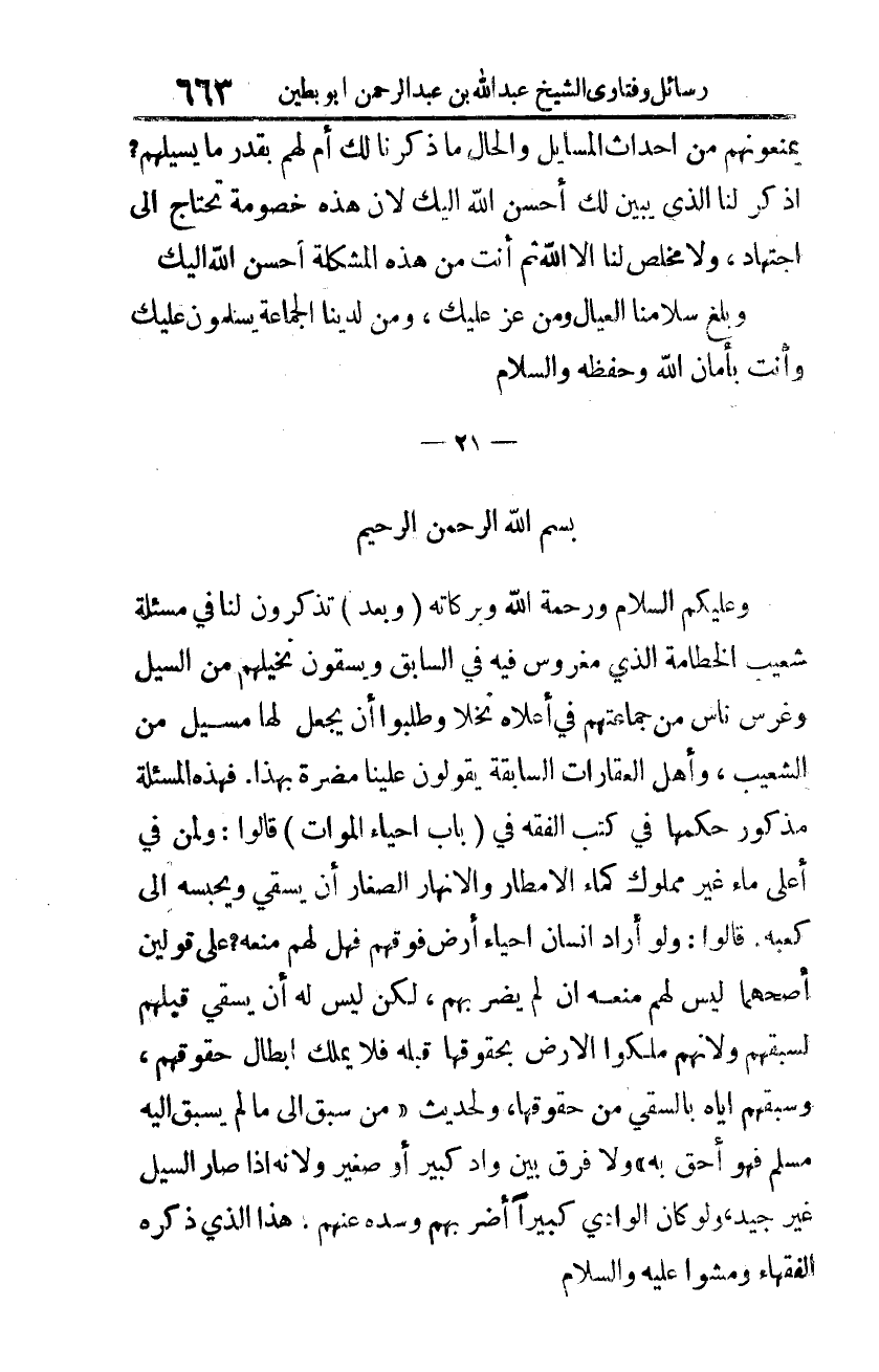 تذكرون لنا في مسألة شعيب الخطامة الذي مغروس فيه في السّابق ويسقون نخيلهم من المسيل وغرس ناس من جماعتهم في أعلاه نخلًا وطلبوا أن يجعل لها مسيل من الشّعيب، وأهل العقارات السّابقة يقولون علينا مضرّة بهذا. فهذه المسألة مذكور حكمها في كتب الفقه في (باب إحياء الموات). قالوا: ولِمَن في أعلى ماء غير مملوك كماء الأمطار والأنهار الصّغار أن يسقي ويحبسه إلى كعبه. قالوا: ولو أراد إنسان إحياء أرض فوقهم فهل لهم منعه؟ على قولين أصحّهما ليس لهم منعه إن لم يضربهم، لكن ليس له أن يسقي قبلهم لسبقم، ولأنّهم ملكوا الأرض بحقوقها قبله فلا يملك إبطال حقوقهم، وسبقهم إيّاه بالسّقي من حقوقها، ولحديث: "مَن سبق إلى ما لم يسبق إليه مسلم فهو أحقّ به"، ولا فرق بين وادٍ كبيرٍ أو صغيرٍ؛ ولأنّه إذا صار السّيل غير جيد، ولو كان الوادي كبيرًا أضربهم وسدّه عنهم. هذا الذي ذكره الفقهاء ومشوا عليه. والسّلام.