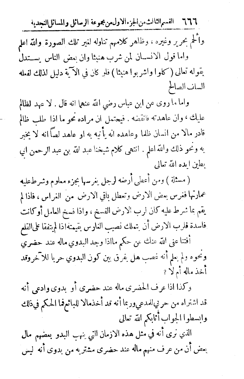 الّذي نرى أنّه في مثل هذه الأزمان الّتي ينهب البدو بعضهم مال بعض أنّ من عرف منهم ماله عند حضري مشتريه من بدوي أنّه ليس