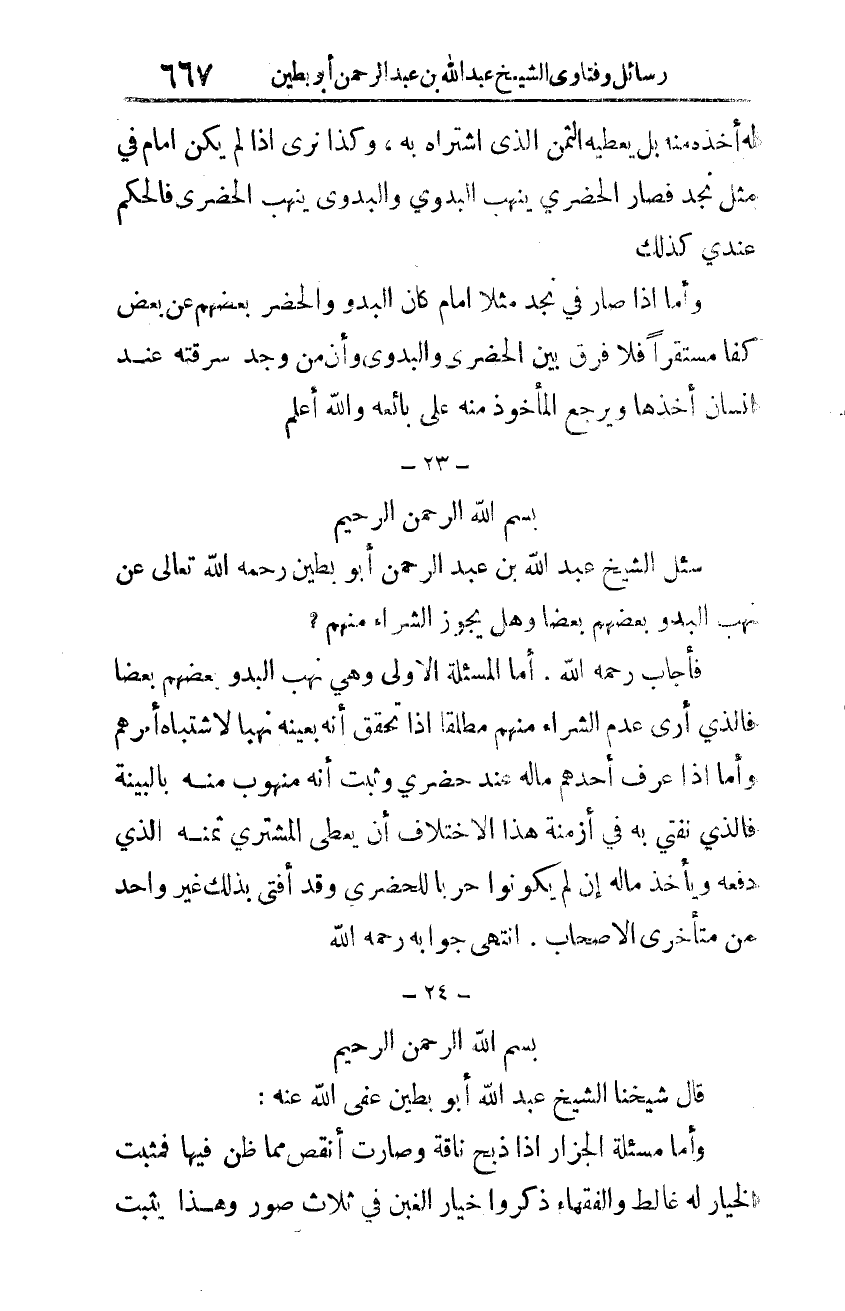 فأجاب -رحمه الله- أمّا المسألة الأولى وهي نهب البدو بعضهم بعضا فالّذي أرى عدم الشّراء منهم مطلقًا إذا تحقق أنّه بعينه نهبًا لاشتباه أمرهم، وأمّا إذا عرف أحدهم ماله عند حضري وثبت أنّه منهوب منه بالبيّنة فالّذي نفتي به في أزمنة هذا الاختلاف أن يعطى المشتري ثمنه الّذي دفعه ويأخذ ماله إن لم يكونوا حربًا للحضري وقد أفتى بذلك غير واحد من متأخري الأصحاب. انتهى جوابه -رحمه الله-.