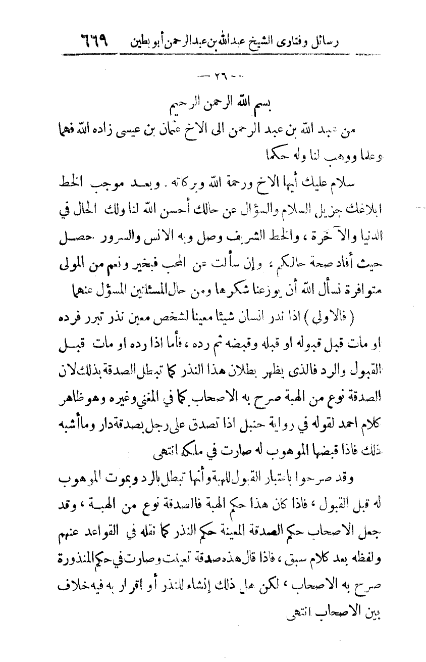 من عبد الله بن عبد الرّحمن إلى الأخ عثمان بن عيسى زاده الله فهمًا وعلمًا ووهب لنا وله حكمًا.