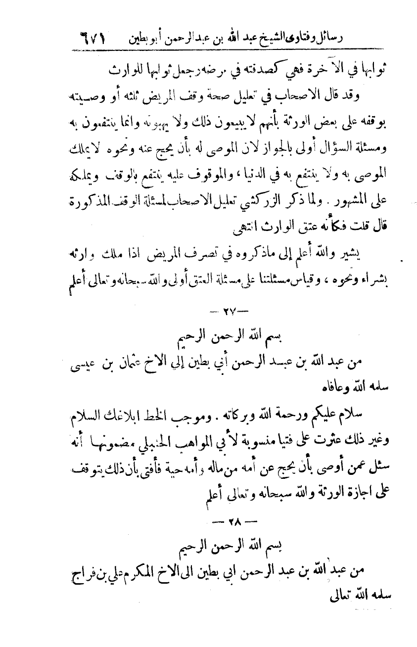 من عبد الله بن عبد الرّحمن أبي بطين إلى الأخ عثمان بن عيسى -سلّمه الله وعافاه-.