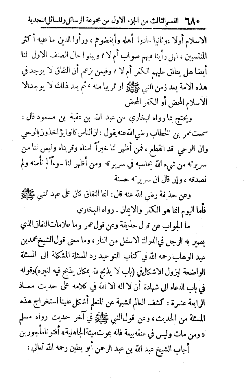 الإسلام أوّلًا، وثانيا عادوا أهله وأبغضوهم، ورأوا الدّين ما عليه أكثر المنتسبين، فهل رأينا فيهم صواب أم لا؟ وبيّنوا حال الصّنف الأوّل لنا أيضا هل يطلق عليهم الكفر أم لا؟ وفيمن يزعم أنّ النّفاق لا يوجد في هذه الأمة بعد زمن النّبيّ -صلّى الله عليه وسلّم- أو قريبا منه، ثمّ بعد ذلك لا يوجد إلّا الإسلام المحض أو الكفر المحض.