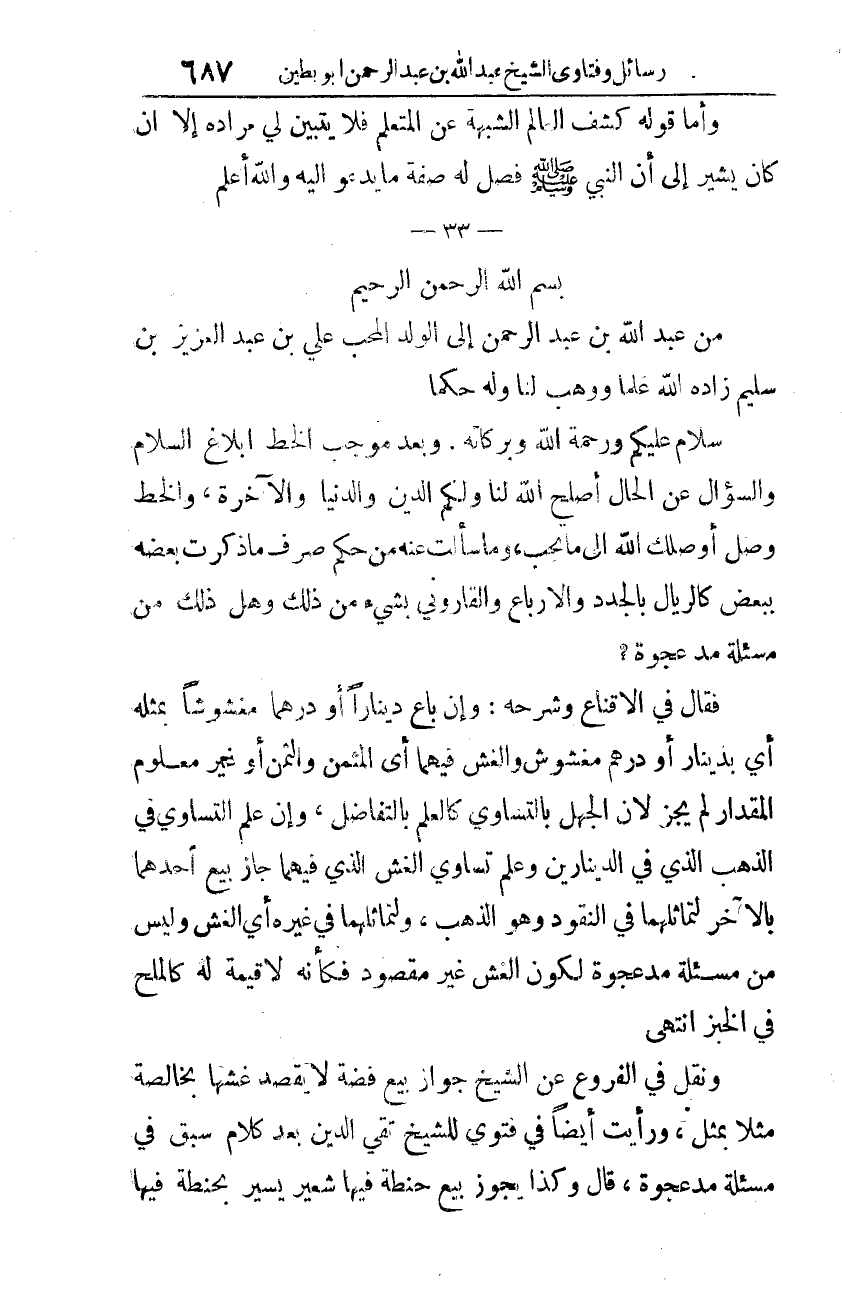 من عبد الله بن عبد الرّحمن إلى الولد المحب عليّ بن عبد العزيز بن سليم -زاده الله علمًا ووهب لنا وله حكمًا-.