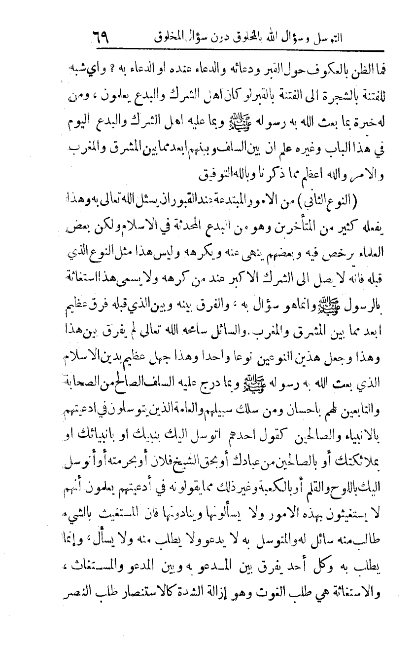 (النوع الثاني): من الأمور المبتدعة عند القبور أن يسأل الله تعالى به؛ وهذا يفعله كثير من المتأخرين، وهو من البدع المحدثة في الإسلام، ولكن بعض العلماء يرخص فيه وبعضهم ينهى عنه ويكرهه. وليس هذا مثل النوع الذي قبله، فإنه لا يصل إلى الشرك الأكبر عند من كرهه ولا يسمى هذا استغاثة بالرسول صلى الله عليه وسلم، وإنما هو سؤال به.
